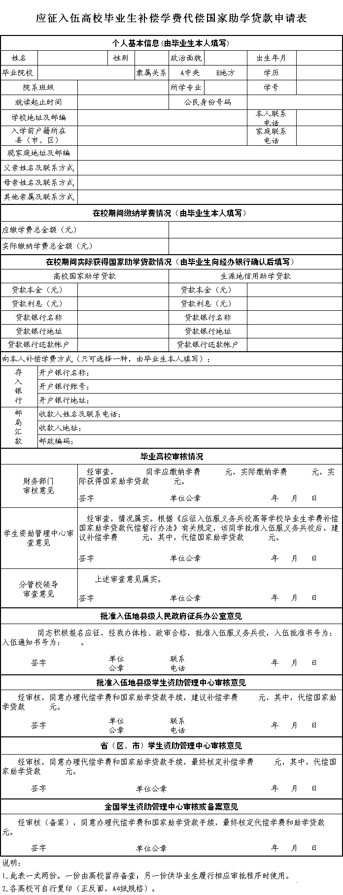 (五)次年1月15日前,县(市、区)教育行政部门将户籍为本县(市、区)的应征入伍高校毕业生的《应征入伍通知书》复印件及《应征入伍高校毕业生补偿学费和代偿国家助学贷款申请表》原件,寄送至应征入伍毕业生原就读高校员工资助管理机构。