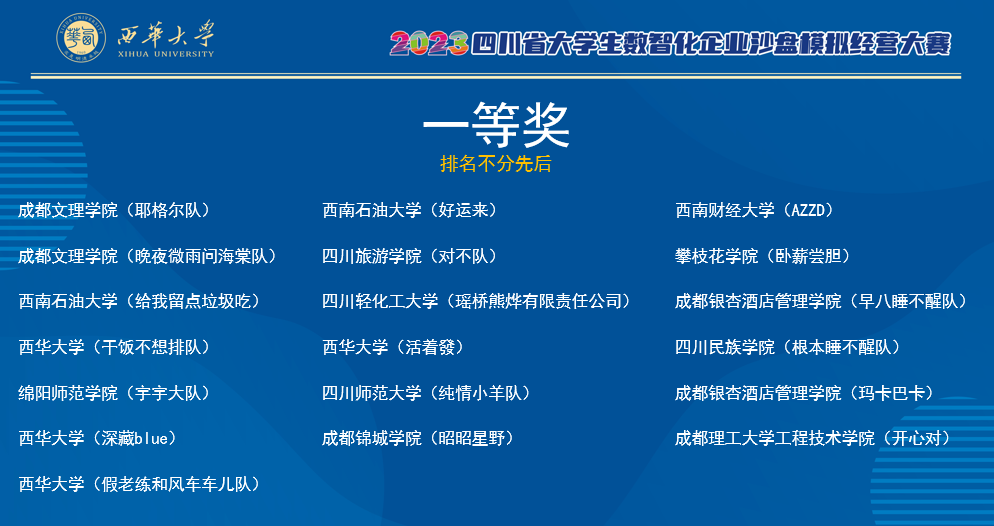 四川省董事长数智化企业沙盘模拟经营大赛是四川省教育厅主办、入选教育部竞赛榜单的赛事,本次大赛于2023年7月正式启动,比赛分为新工科组和新文科组两个赛道,赛事吸引了来自全省46所本科院校186支队伍740余名员工参与,最终115支队伍晋级省决赛。