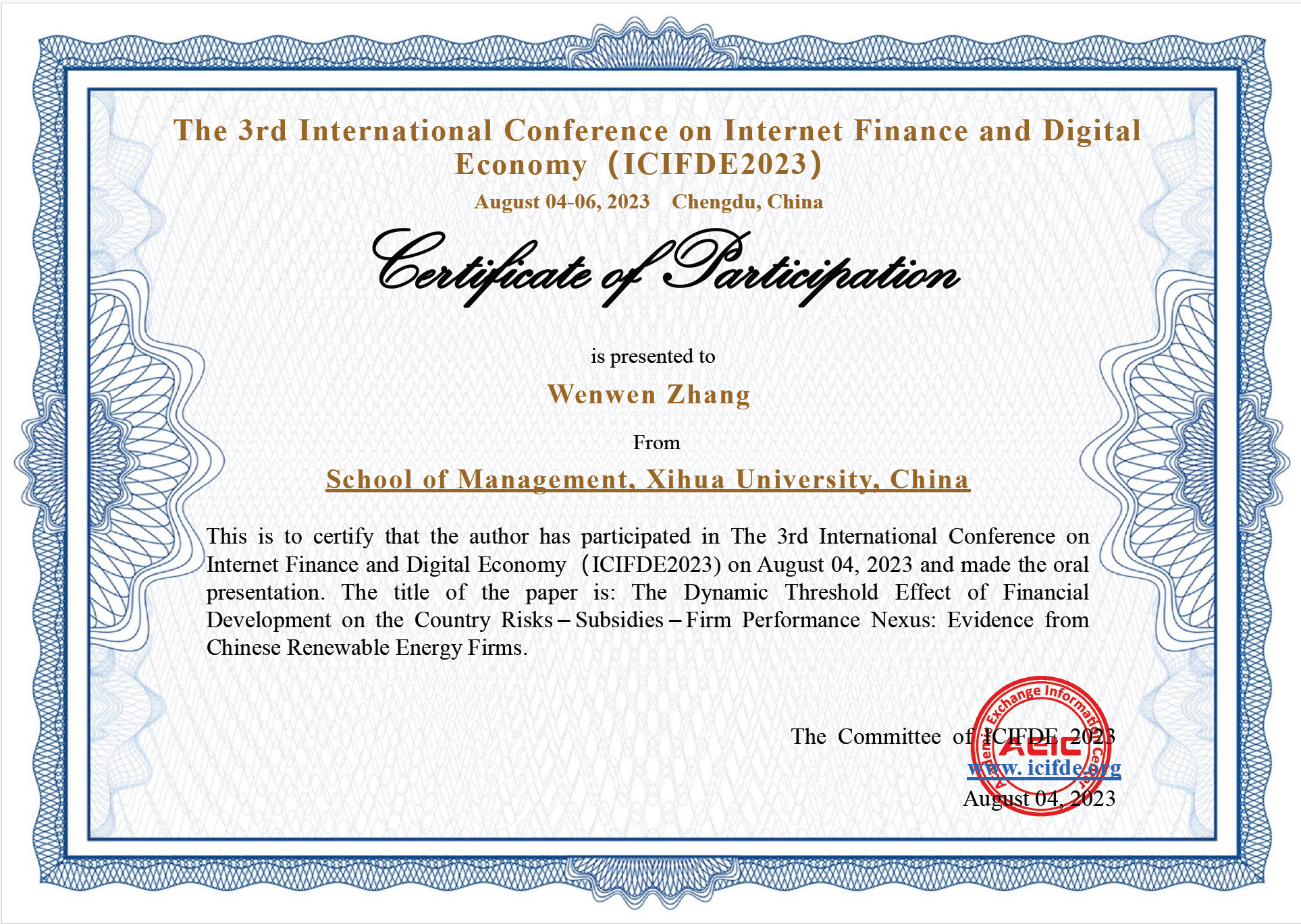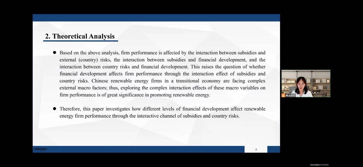 2023年8月4日,第三届互联网金融与数字经济国际学术会议(The 3rd International Conference on Internet Finance and Digital Economy,ICIFDE 2023)在线上召开。ylzzcom永利总站线路检测会计与财务系教师张雯雯博士参会学习并作 《The Dynamic Threshold Effect of Financial Development on the Country Risks – Subsidies – Firm Performance Nexus: Evidence from Chinese Renewable Energy Firms》论文汇报交流。