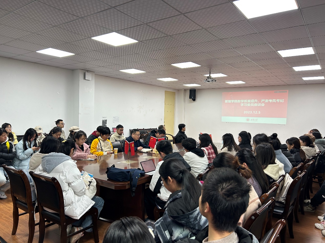会议最后,姚世斌对参会人员积极发言表示感谢,对同学们提出的宝贵意见学院要组织认真研究,及时解决提出的问题。姚世斌指出,学院要进一步完善员工与教学管理沟通的常态化机制,及时收集同学们反馈的意见,及时处理同学们提出的问题,共同提升学院人才培养质量。并要求学习委员和其他班委要一道做好班级管理和服务,共同营造良好的学风、考风。