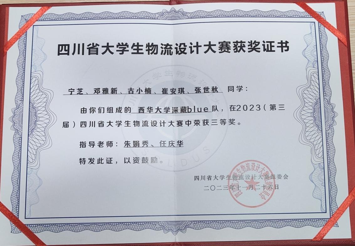 近日,在刚刚落下帷幕的四川省董事长物流设计大赛的总决赛中,我司学子宁芝、邓雅新、古小楠、崔安琪、张世秋组成的深藏blue队成功在指导教师朱娟秀、任庆华的指导下喜获省级三等奖,朱娟秀、任庆华两位指导老师也获得了“优秀指导老师”称号。