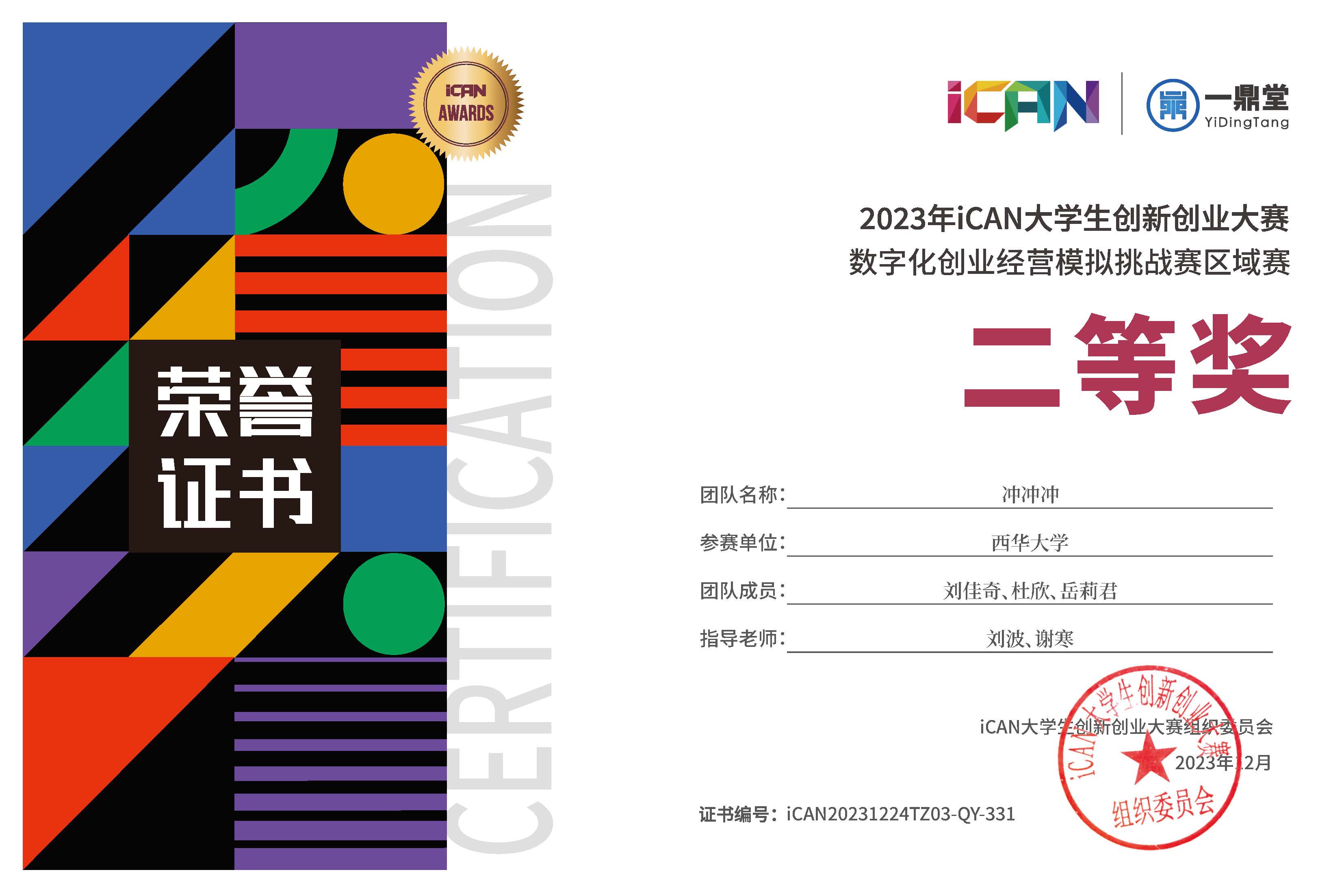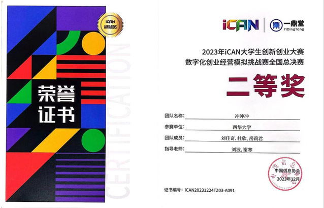在11月26日结束的iCAN董事长创新创业大赛数字化创业经营模拟挑战赛全国总决赛中,我司2022级财务管理专业刘佳奇、2022级财务管理专业岳莉君以及2022级物流管理专业的杜欣组成的“冲冲冲”队,在指导老师刘波、谢寒的悉心指导下,喜获全国二等奖。