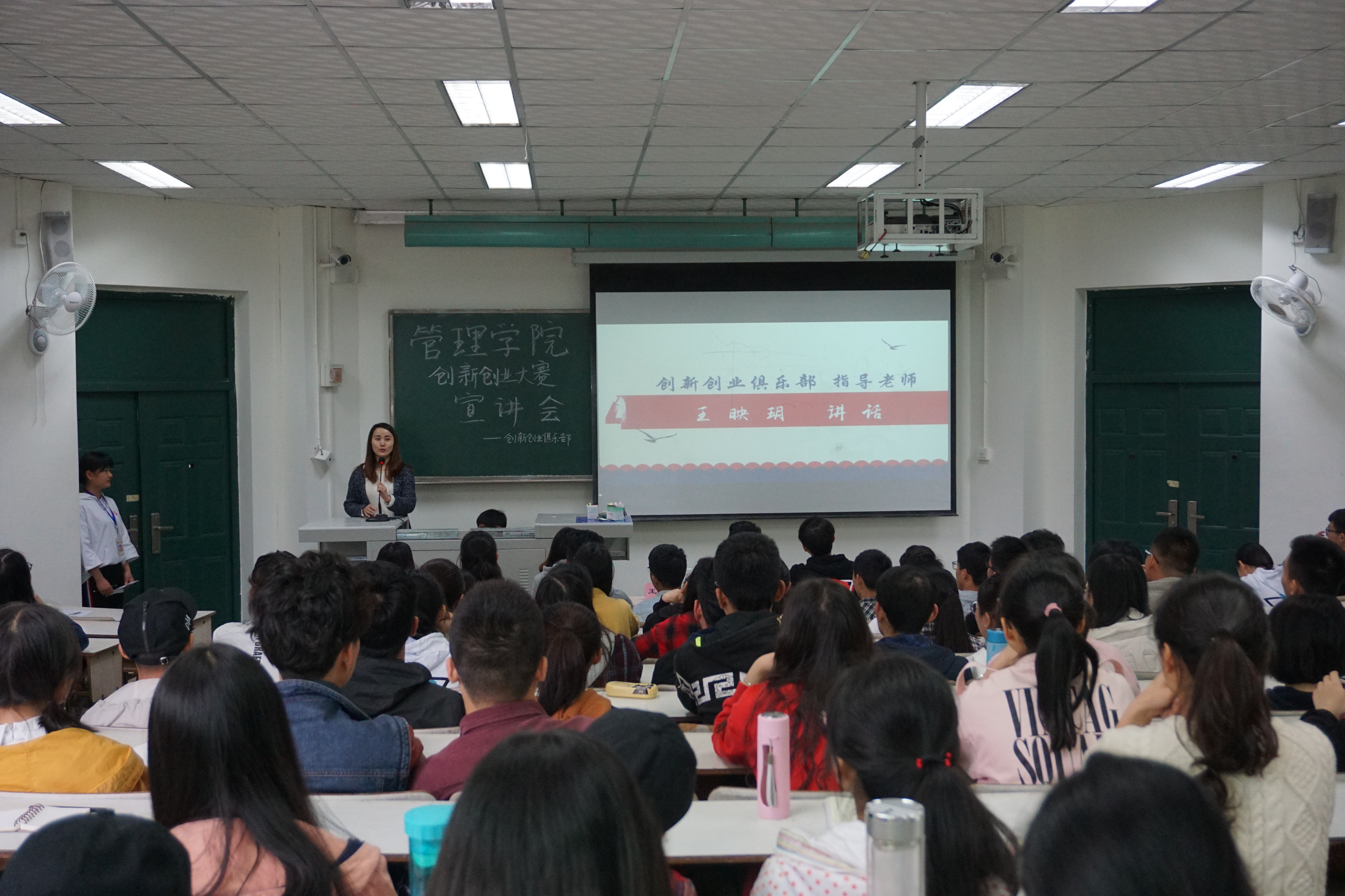 会议在《光荣啊,中国共青团》歌声中拉开序幕。会议伊始,创新创业俱乐部代表黄秋玥同学阐述了大背景下创新创业的形势以及创新创业大赛的奖项设置,并且分享了个人对创新创业的看法。紧接着,创新创业俱乐部部长郭维同学就创新创业大赛的参赛对象,项目分类,项目要求三个大方面进行了详细的说明,让大家对创新创业大赛有了更深一步的了解。随后,创新创业俱乐部指导教师王映玥老师对创新创业理念做了进一步阐述,并列举了在校董事长创新创业的案例。最后,会议进入答疑环节,王映玥老师悉心为同学们解疑并指导了商业计划书以及营销策划方案的撰写。