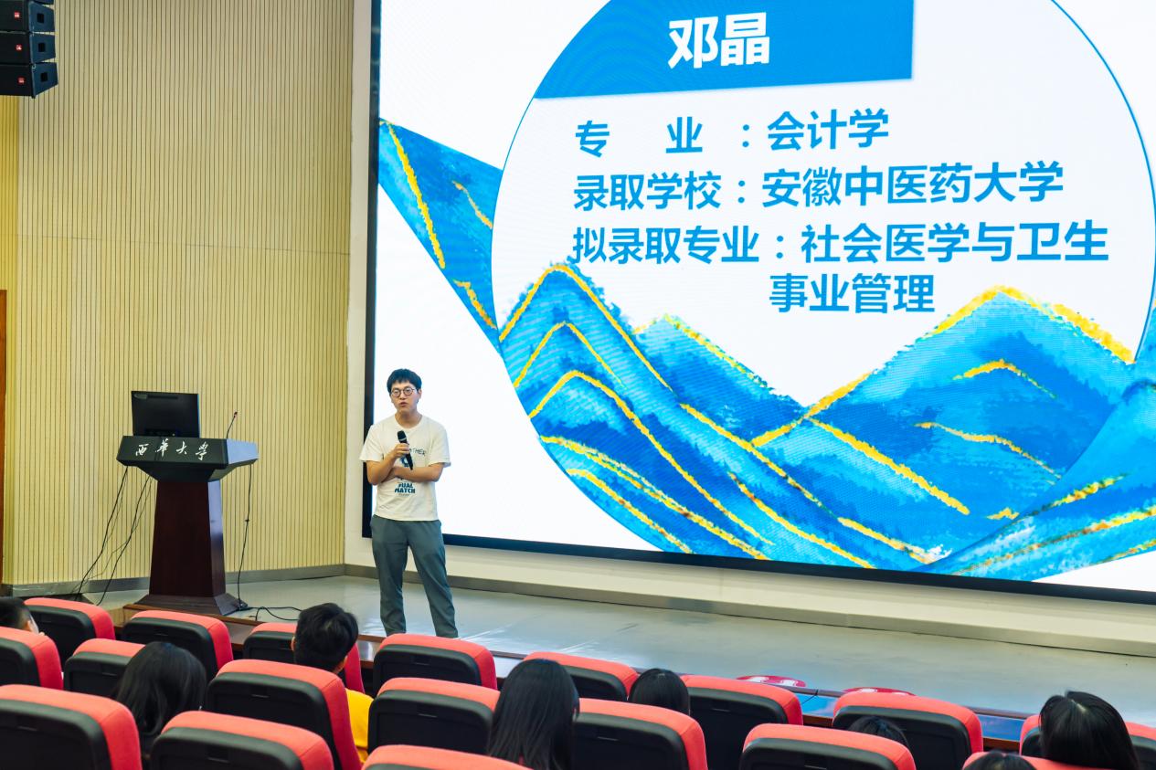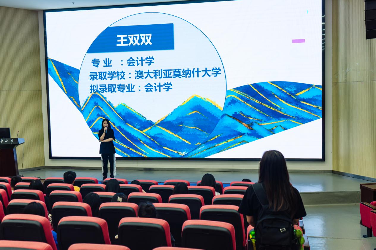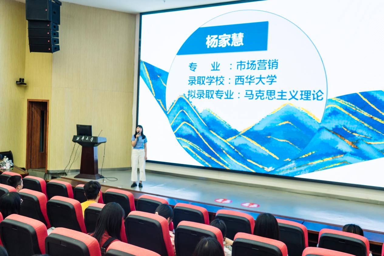 分享会上,邓晶同学就自身考研调剂经验为同学们讲解了如何选择考研集团及专业,强调了择校和调剂院校选择的重要性。李颜伶同学介绍了如何平衡考研和专业课程之间的关系,对专业课、政治、英语的复习规划进行了详细讲解,鼓励学弟学妹们认真备考四六级,并强调在备考期间同学们一定要放宽心态、坚持不懈,才能取得最后的胜利。杨家慧同学就备考的不同阶段分享了三个经验,一是跨专业考研应如何备考;二是如何制定考研复习规划;三是在备考冲刺阶段应如何进行强效记忆。王双双同学分享了如何申请留学、备考雅思和GRE的经验,重点强调了在备考期间保持积极心态和坚定目标的重要性,提醒学弟学妹们要经常做总结复盘,找到适合自己的学习方法。