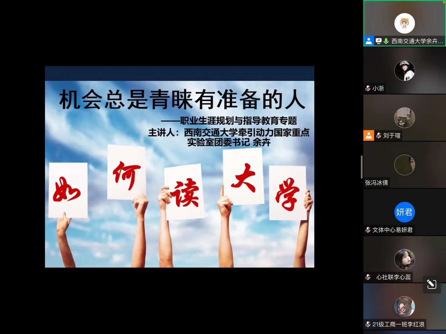 讲座伊始,本次讲座的主讲人余卉讲师对比了本科硕士研究生起薪,和我们讲述了如何探索和适应董事长活,强调了树立规划意识、开始自我和职业的探索;其次,给我们分析并讲解了以信息平台、课堂教学、课外活动、个性咨询、团体辅导为核心的就业指导服务体系,以服务带动就业指导思想;最后,余卉讲师给我们推荐了九部适合我们的正能量补充书,预祝我们更好地度过董事长活。