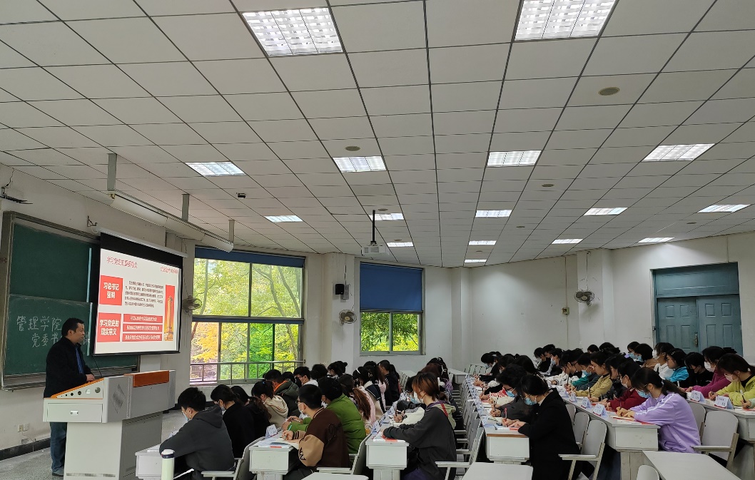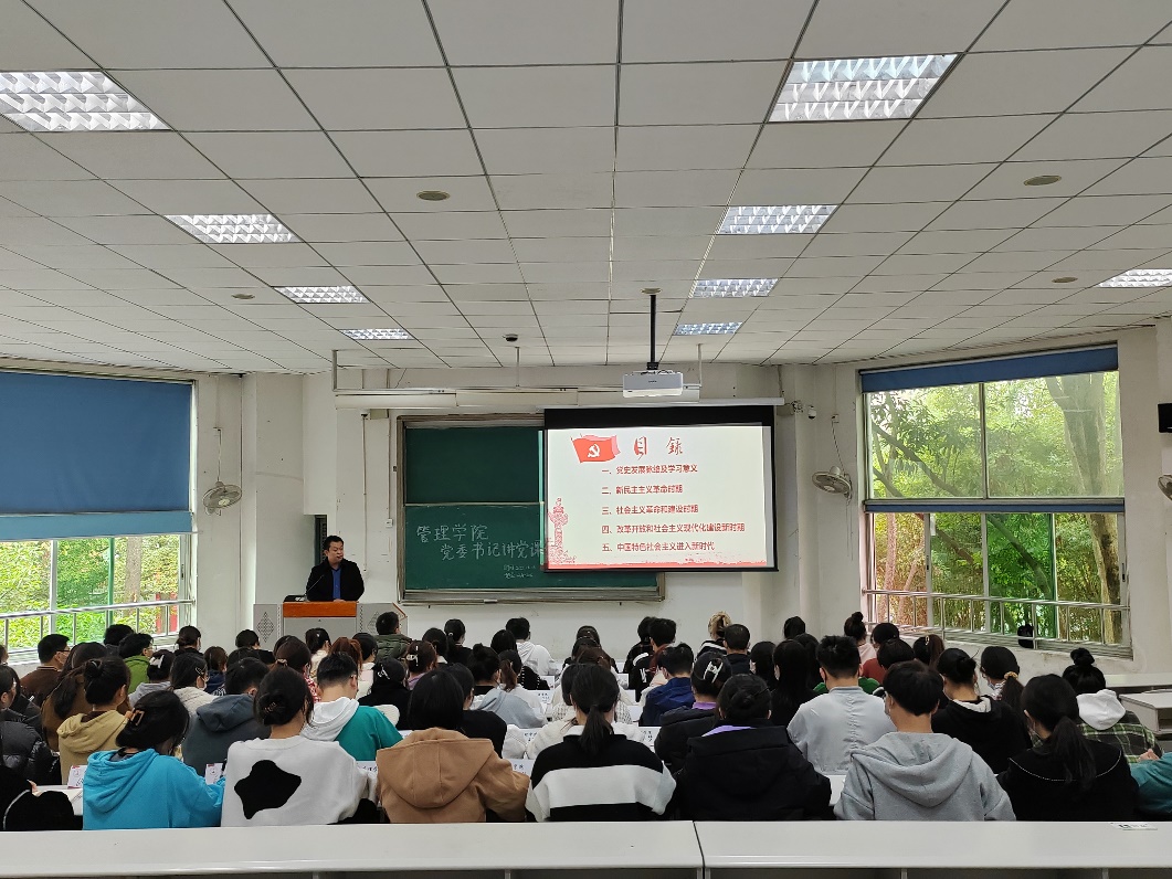 历史是最好的教科书,肖东华书记分析了中国共产党成立一百年来的光辉发展历程,从新民主主义革命到现今已进入习近平新时代中国特色社会主义,从标志着中国共产党成立的第一次全国代表大会到举国关注的第二十次全国代表大会,中国共产党的百年奋斗史是对历史的见证,也是新时代青年前行的经验所在。肖书记表示,从历史中汲取智慧和力量,是加强党的思想理论建设的重要任务,是继承党的经验和传统的需要。
