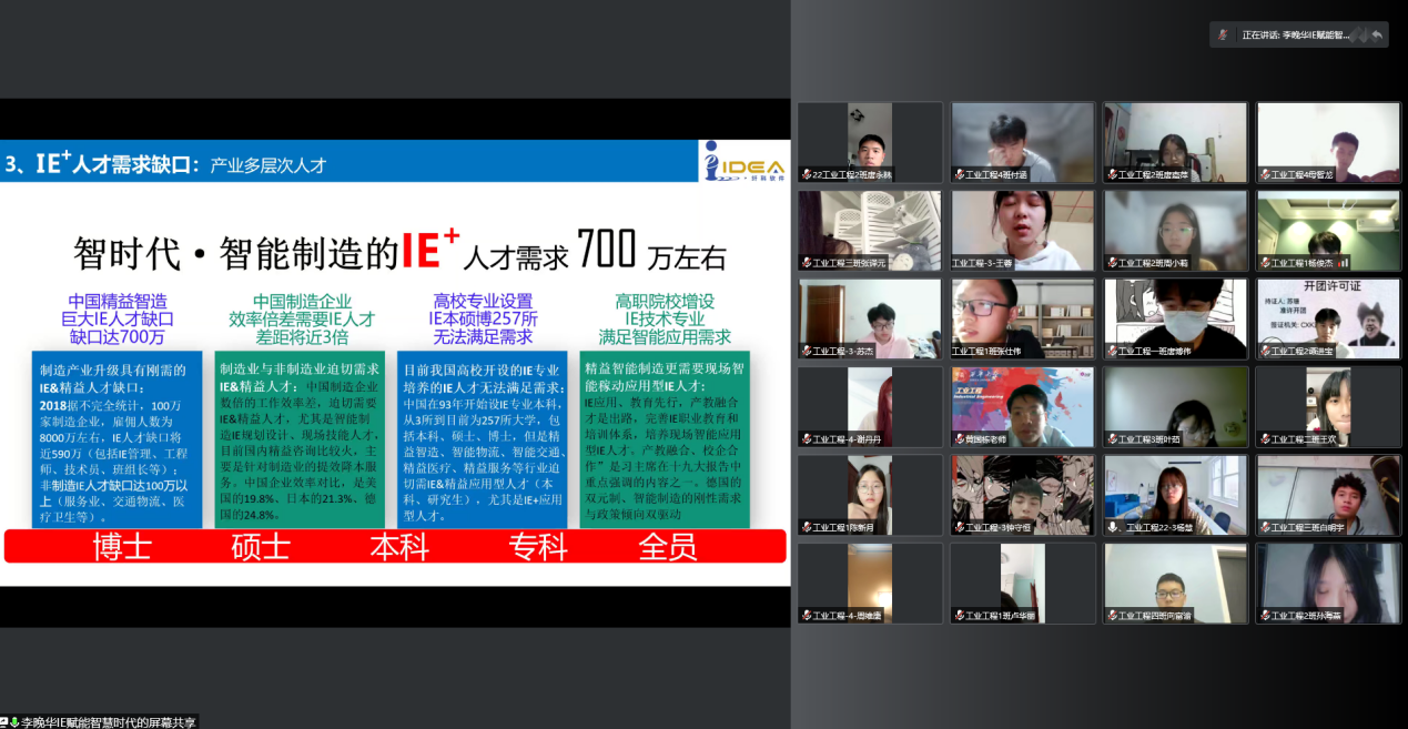 本次线上论坛由黄国栋老师主持,随后李晚华员工分享了产业升级、IE人才需求、产教融合——IE人才成长路径探讨;IE达人罗超分享了成长经历与典型案例;2010级工业工程员工蒲恩亚分享了成长经历与创业历程;2018级员工吴明灿、17级员工李旭峰和陈玥彤结合目前在昆明理工大学攻读质量方向和数据方向研究生经历,向学弟学妹们介绍了夯实本科知识的重要性。IE专业负责人、在读博士梁俊勇分享了成长经历与 IE 人才培养建议。